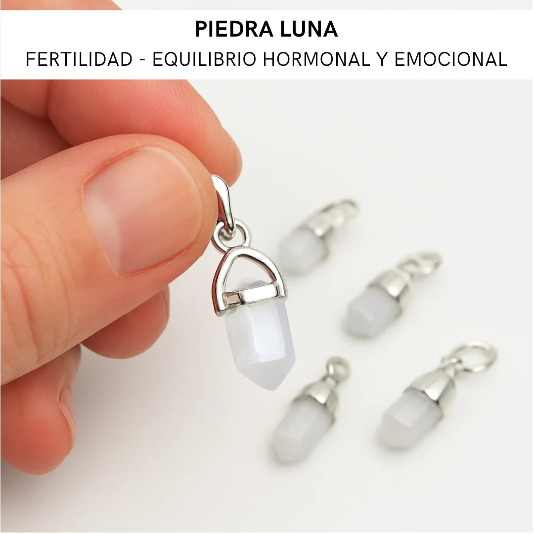 La Piedra Luna es un mineral profundamente ligado a la energía femenina, la intuición y los ciclos hormonales de la mujer, ayudando a equilibrar las emociones y a fluir con mayor suavidad en el día a día. Su forma biterminada, con dos puntas, permite que la energía fluya en ambas direcciones, creando un equilibrio continuo entre dar y recibir.