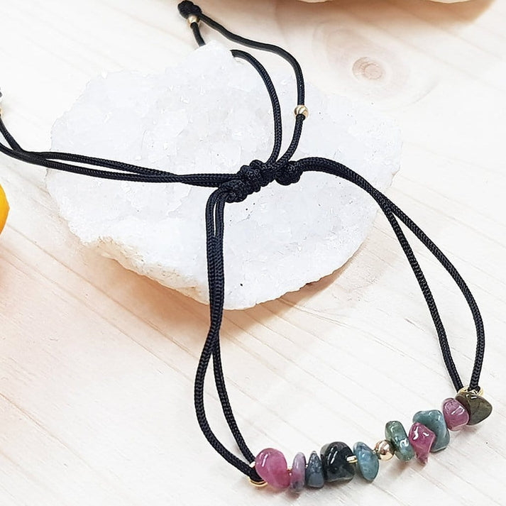 Esta pulsera está hecha a mano con hilo de macramé negro, combinando trocitos de turmalina de colores naturales. Cada pieza es única, porque cada fragmento de mineral es diferente, como la persona que la lleva.