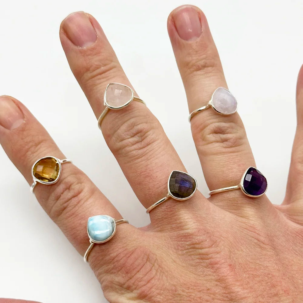 - Lágrima tallada de mineral natural a elegir entre: larimar, amatista, cuarzo rosa, citrino, labradorita y piedra luna